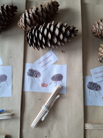 Esittelyn jälkeen otimme pienen kilpailun käpyjen tarkuusheitossa. Punaiset ja siniset kilpailivat kumpi joukkue saa enemmän käpyjä ympyrän sisälle ja niinhän siinä sattui onnekkaasti, että molemmat joukkueet saivat yhtä paljon ja kaikki saivat palkinnon.